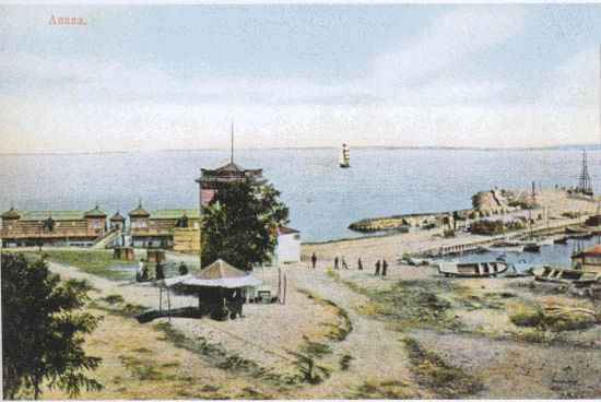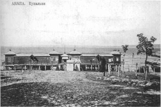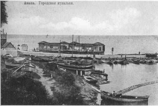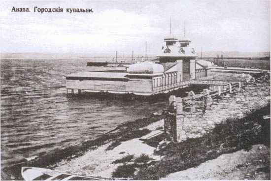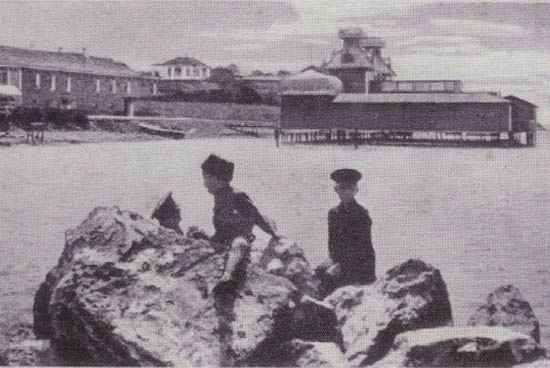 Рядом с пристанью в 1894 г. была построена городская купальня с двумя отделениями – мужским и женским. Ее изображение мы видели на рис. 30. Купальня была установлена на деревянные сваи и имела сколоченные из досок стены и полы. С берега к ней был перекинут мостик с перилами, которыми во избежание падения в воду она была охвачена со всех сторон. Фигурная крыша имела небольшие шпили, что придавало ее виду некоторый шарм. В полах купальни были сооружены ступенчатые лестницы, по которым можно было спуститься для купания в море.
