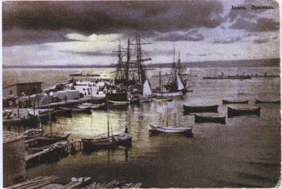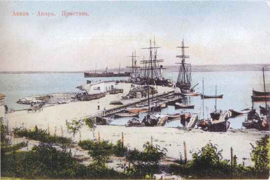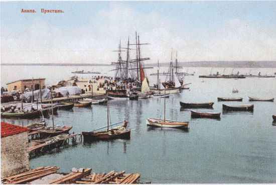 Находясь на берегу моря, Анапа не могла не иметь своей пристани. Как мы ранее уже отметили, в античность и в средневековье здесь велась оживленная торговля, и товары доставлялись в большом объеме морским путем. В XIX в. Анапа становится морским портом с каботажным (прибрежным) плаванием. Грузы перевозились, в основном, вдоль побережья Черного и Азовского морей, причем особенно оживленные перевозки осуществлялись с Керчью. Именно поэтому улица, ведущая к городской пристани, и была названа Керченской. С развитием города в конце XIX в. потребности в увеличении морского грузооборота заметно возросли, и в 1890 г. была сооружена насыпь из дикого камня для защиты судов от штормов и более удобной загрузки и погрузки, где и была оборудована пристань, виды которой легли в основу целой серии открыток.