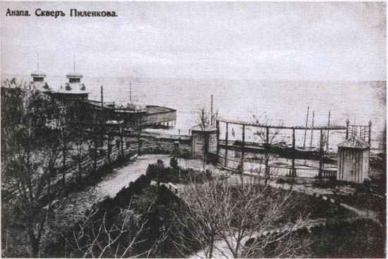 Перед пристанью и купальней был разбит сквер Пиленкова. Спуск к морю в этом месте был пологим и удобным для устройства небольшого парка. О главе этого семейства Дмитрии Васильевиче Пиленко, знаковой фигуре в истории нашего города, мы уже писали ранее. Генерал Д. В. Пиленко принимал участие в разработке городского плана. По его инициативе первой в городе подверглась мощению улица Керченская, а рядом с ней на пустыре у пристани был заложен в 1892-1893 гг. небольшой сквер, который и стал носить его имя. Кстати, в квартале от сквера находилось домовладение семьи Пиленко и одноименный скверу переулок.
