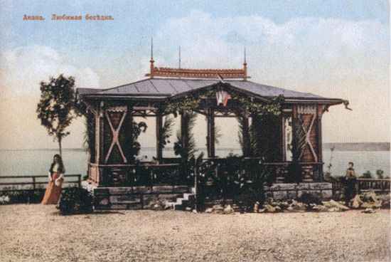 Рядом с раковиной и танцевальной площадкой на самом мысу стоял маяк с винтовой лестницей. Он виден на многих открытках. Это был один из объектов маячного хозяйства города – портовый огонь, установленный на 10-метровой башне в помощь судам, подходящим ночью к пристани Анапской бухты. Надо отметить, что он прекрасно дополнял экзотический вид прибрежного уголка городского сада. Первоначально у маяка находился тот гигантский якорь, который чуть позже будет перенесен на пристань (мы видели его на рис. 50-53). Тут же находились две артиллерийские пушки, которые позже будут выставлены у «Русских ворот». Среди достопримечательностей были и два артиллерийских снаряда, выпущенных турецкой корабельной артиллерией по городу во время русско-турецкой войны 1877-1878 гг., упавших на территорию будущего сада и остававшихся здесь как свидетельства грозного прошлого Анапы. К открытию в «Русских воротах» часовни в 1913 г. пушки и снаряды были перенесены к ним из городского сада для создания мемориального комплекса.