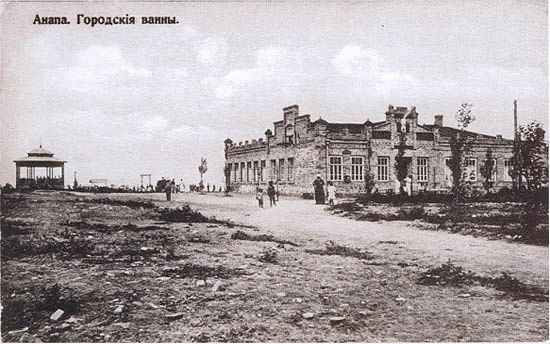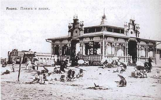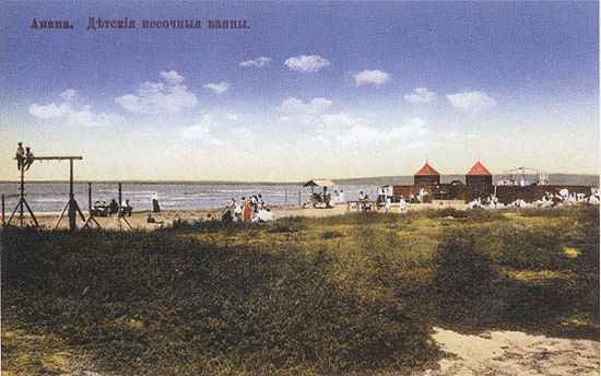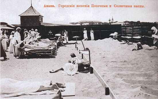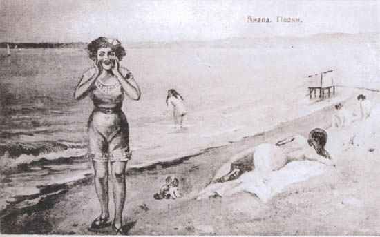 Песчаный пляж в Анапе – предмет особой гордости. Нередко называют его «золотым» или «ласковым берегом». Никто не станет оспаривать тот факт, что люди ехали и едут по сей день в Анапу прежде всего за тем, чтобы укрепить свое здоровье на морском берегу, и купание в море и отдых на лучшем для этого месте – городском песчаном пляже – влекло сюда массу народа. И одной из главных проблем, от чего «болела голова» у городских властей, было создание уюта и ухоженности на городском пляже. Стараниями городской управы на пляже были сооружены купальни-раздевальни. Замечу, что они назывались «раздевальнями» не в смысле дорогой цены за пользование ими, ибо билетик сюда стоил всего 2 коп. за одно посещение, а потому, что зайти в воду в оживленном месте, не имея купальника, бывшего тогда редкостью, и быть при этом незамеченным, составляло большой труд. Таким образом, можно было по мостику пройти в закрытую купальню, раздеться там, оставив на хранение одежду, а затем спокойно спуститься из нее в море и насладиться купанием.
