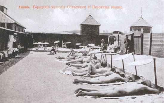 Мы уже говорили о том, что санаторный комплекс «Бимлюк» был открыт в районе превосходного песчаного пляжа. Поэтому для принятия солнечных и песчаных ванн здесь были оборудованы две площадки, огороженные со всех сторон высоким забором. На этих площадках (мужская и женская) были установлены деревянные лежанки, где под наблюдением ответственного лица пациенты могли хорошо загореть, оборудованы места, в которых можно было полностью погрузиться в нежный горячий песок, а рядом установлены чаны с морской водой, где можно было омыться после принятия песчаных ванн.