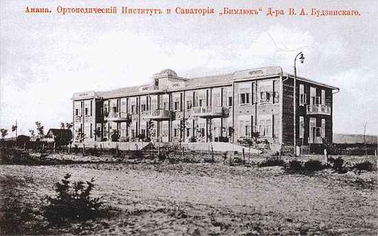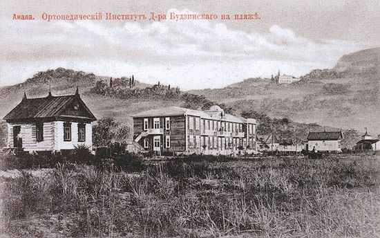 В справочной книге «Черноморское побережье Кавказа» мы читаем: «Ортопедический институт с санаторией «Бимлюк» д-ра Будзинского на дальнем пляже. Ортопедический институт расположен на дивном песчаном «золотом» пляже в расстоянии 6 верст от города; он открыт с 15-го мая в течение всего летнего сезона и состоит в заведывании ассистента ортопедической клиники Императорской Военно-Медицинской Академии д-ра медицины А. К. Шенка.