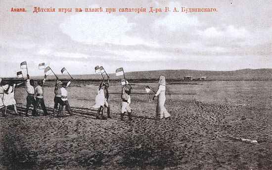 Для детей санатория «Бимлюк» на пляже проводились гимнастические игры. Руководили ими опытные фребелички, работавшие в санатории и организовывавшие для детей досуг.