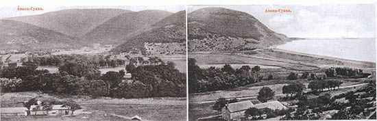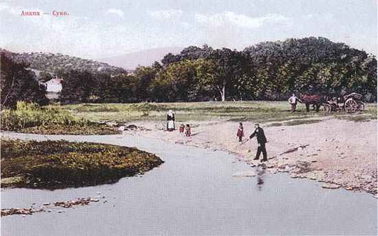 Число открыток, выпущенных до 1917 г. и изображавших окрестности Анапы, чуть более десяти. Наибольшее число их представляет Сукко, остальные – Утриш и Семигорье. И это неслучайно. Долина Сукко является одним из самых живописных мест в анапских окрестностях. В начале XX в. земли эти принадлежали графу Т. М. Лорис-Меликову. Имение в Сукко он получил в наследство от своего знаменитого отца – графа Михаила Тариэловича Лорис-Меликова. В годы Кавказской, а затем и последней русско-турецкой войны он был одним из руководителей действиями русских войск на Кавказе. В 1880-1881 гг. М. Т. Лорис– Меликов был Министром внутренних дел России. Еще в 1869 г. он получает в качестве награды за заслуги 6000 десятин в Сукко, где строит свое имение, закладывает сады и виноградники. В начале XX в. имение, хозяином которого был уже его сын граф Т. М. Лорис-Меликов, становится довольно развитым. Главным управляющим имения был В. А. Меркулов, который, кстати, принимал активное участие в общественной жизни города (он был членом Общественного комитета по содействию благоустройству курорта и его окрестностей, созданного в Анапе в 1913 г.). Граф Лорис-Меликов добивается к 1913 г. разрешения на строительство в своем имении небольшого порта, планируя разместить его в озере, называемом ныне Змеиным. Кроме того, прорабатывались планы передачи этих земель в аренду иностранным капиталистам для создания здесь крупного курорта.