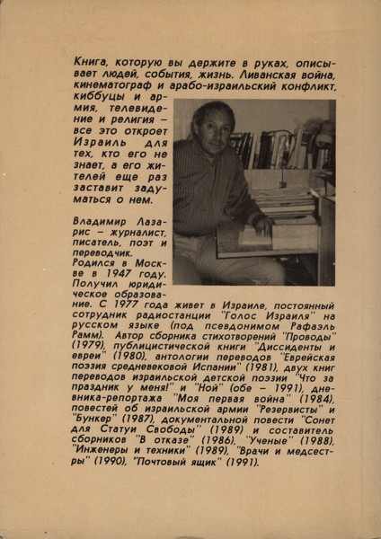 Владимир Лазарис – журналист, писатель, поэт и переводчик. Родился в Москве в 1947 году. Получил юридическое образование. С 1977 года живет в Израиле, постоянный сотрудник радиостанции «Голос Израиля» на русском языке (под псевдонимом Рафаэль Рамм). Автор сборника стихотворений «Проводы» (1979), публицистической книги «Диссиденты и евреи» (1980), антологии переводов «Еврейская поэзия средневековой Испании» (1981), двух книг переводов израильской детской поэзии «Что за праздник у меня!» и «Ной» (обе – 1991), дневника-репортажа «Моя первая война» (1984), повестей об израильской армии «Резервисты» и «Бункер» (1987), документальной повести «Сонет для Статуи Свободы» (1989) и составитель сборников «В отказе» (1986), «Ученые» (1988), «Инженеры и техники» (1989), «Врачи и медсестры» (1990), «Почтовый ящик» (1991).