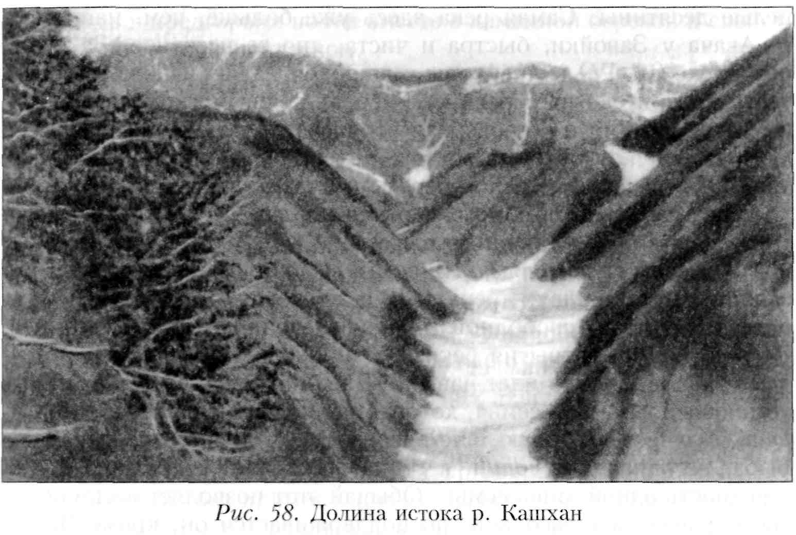 Спустившись опять в долину, мы увидали впереди узкое теперь ущелье Кашхан, перегороженное во многих местах крупными завалами снега. Форма его, лотком, напоминает троги европейских Альп. Речка, текущая среди довольно обширных галечников, прижата к подножию левого склона долины, а у подножия правого склона идут терраски с главным здесь горячим ключом. Ключ этот, с температурой до 40°, вытекает на верху туфовой площадки, сложенной из образованных им же железо-известковистых отложений. Он так же, как и другие ключи Пущинской группы, обрамлен густой, однообразной зеленью невысоких болотистых трав (как, например, Triglochin и Heleocharis). Воды ключика стекают с терраски в небольшую протоку с сильно железистой гнилой водой, отделяющую от ключевой терраски галечный заросший островок. Через речку у подножия левого склона долины есть еще ключ с температурой 29°, вытекающий с вершины туфового холмика около 2 арш. вышины. И этот ключ железисто-известковый, без запаха сероводорода.