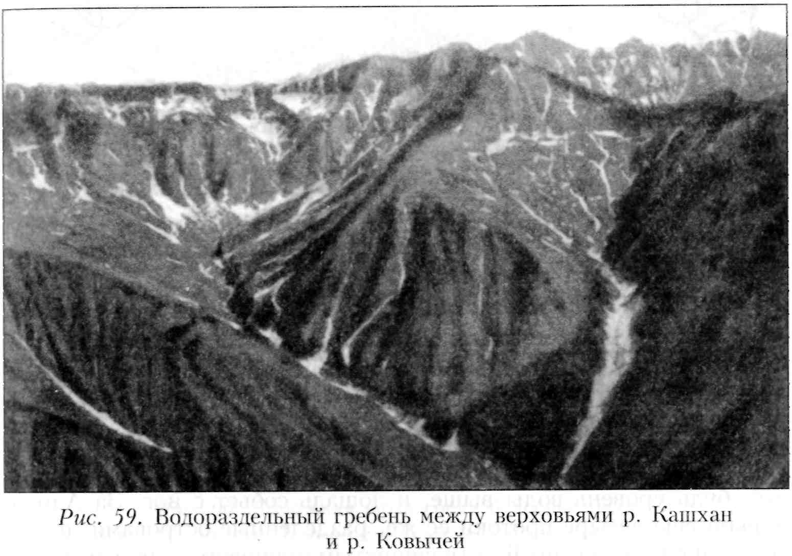 Порода кругом сильно разрушенная, выветрелая, очень светлая, местами каолинизированная и тогда почти белая, из числа сравнительно недавно изверженных. Местами, где ручьи и притоки наворотили мощные груды силевых выносов, кажется, что вся гора превращается в развалину. Слева над галечниками полоса красных глинистых склонов, частью почти лишенных растительности благодаря быстроте разрушения их. Галька силевых выносов очень светлая, с массой мелочи. Боковые галечники частью превращены в сад благодаря обилию цветущих альпийских растений. Я дошел до верхней границы березы и застрял в ольховниках над совсем узким теперь ущельем речки, уже сплошь заваленным снегом. Выше впереди можно было уже хорошо рассмотреть высокий водораздельный гребень, по ту сторону которого находятся истоки Ковычи. Гребень этот, почти лишенный растительности, узкой скалистой стеной обрамляет цирк верховий. Стены этого цирка прорезаны ключевыми и ручьевыми бороздами и образуют ровный, плоский гребень без отдельных выдающихся скал (кекур), имеющий вид гладкой, ровной стены.
