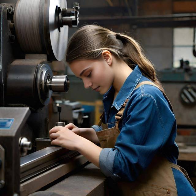Как человек с профессиональным профильным образованием, могу сказать, что в таком виде её бы никто не допустил к станку, ей бы по ходу дела оторвало голову или сорвало скальп, а мастер и начальник ТБ присели бы надолго. Но ИИ видит так, в общем картинка иллюстративная и ни в коем случае ни к чему не призывающая. Короче, иллюстративная картинка будущей невесты ГГ Светлейшей Княжны Ухтомской графини Коссиковской на рабочем месте