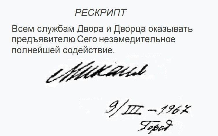 Вызвав дежурного секретаря, Борис дал распоряжения по подготовке машины. И, как только порученец скрылся вскрыл второй конверт. Бумага нового послания тоже пожелтела, но была положена так что сначала шли печати и подпись. Императорские. Заверенные Управлением Двора. На таких «формах», как знал Великий Князь берутся автографы для образца при вступлении на престол. Мария II , Мария I , Александр IV , Михаил… Борис перевернул лист. Новый Рескрипт гласил: «Всем службам Двора и Дворца оказывать предъявителю Сего незамедлительное и полнейшее содействие». Те же дата и роспись…