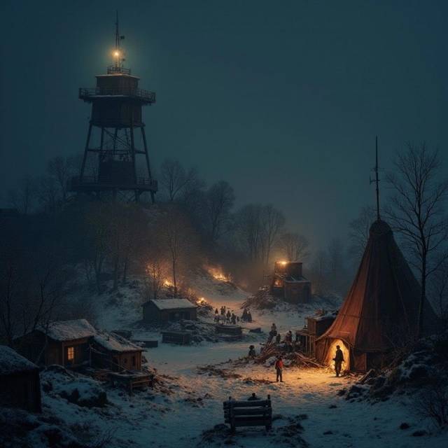 Холм. Луна. Снег. Лёд. Внизу горят костры.