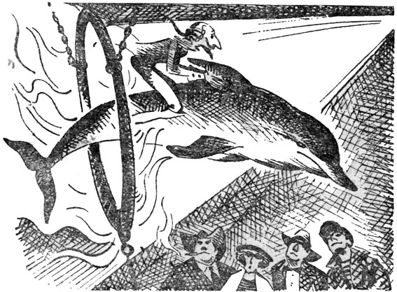 Верхом на дельфине мчался Карл Фридрих Иероним. Нет, нет!.. Это был не мираж, не призрак, не брокенское видение, а наш дорогой Мюнхаузен, живой и невредимый, – на огромном дельфине, который развил скорость свыше пятидесяти узлов.
