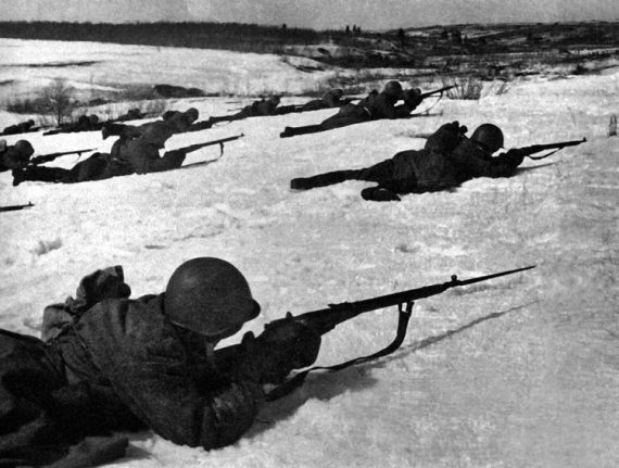 Пулеметный расчет одной из рот 6-го мсп 1-й Гв. мсд поддерживает наступление своей роты. Январь 1942 г.