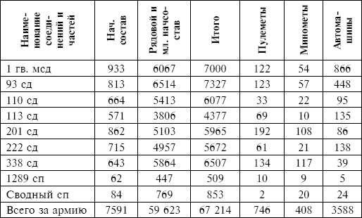 В соединениях армии весьма существенным оставался некомплект офицеров – 2685 человек и младших командиров – 7840 человек.