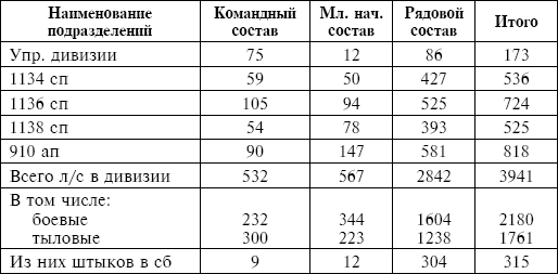 1288-й СП (пехота) – 53 чел.; в спецподразделениях – 214 чел.; в тылах – 159 чел.; 1292-й СП (пехота) – 80 чел.; в спецподразделениях – 256 чел.; в тылах – 174 чел. В других дивизиях аналогично.