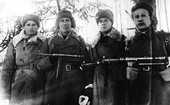 Полковой комиссар А.Ф. Владимиров (второй слева) с группой бойцов и командиров. Март 1942 г.