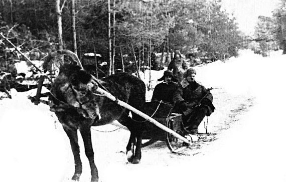 Фото сделано у деревни Лутное. В санях заместитель командира 364-го кап по технической части капитан Ф.Д. Лукин. Рядом с ним красноармеец Граф. Стоит командир батареи звукометрической и фотометрической разведки капитан Мешков. Слева от дороги замаскированы машины его батареи. Март 1942 г.