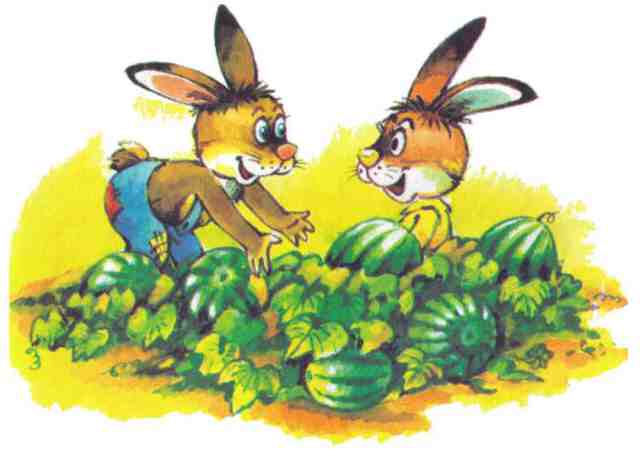 Подбежал дедушка Назар – нет зайцев. Один арбуз в канаве лежит. Подобрал его, лезет наверх, смотрит, а зайцы уж с другого конца бахчи арбуз покатили.