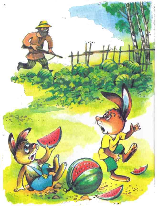 Ещё весной приметил Рваный Бок, где посадили марьевцы арбузы. Раза три наведывался за лето, посмотреть, хорошо ли растут, а как увидел, что начали поспевать арбузы, каждый день бывать начал. И друга с собой прихватывал. Прибегут зайцы, поглядят, где караульщик дедушка Назар, выскочат из кустов, схватят арбуз – и в рощу.