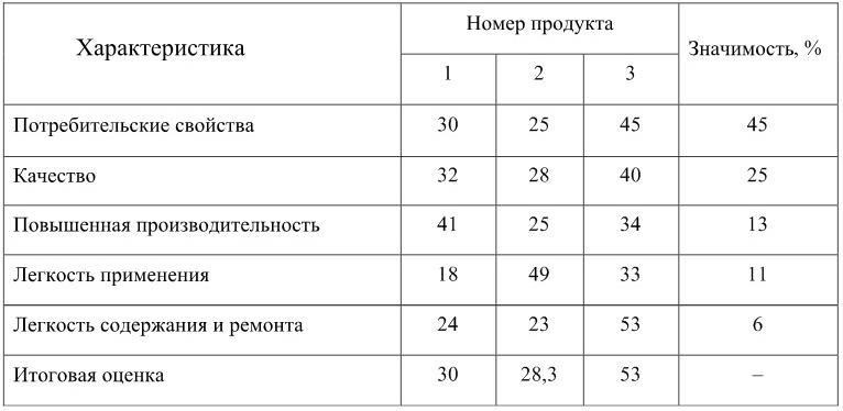 Из приведенной таблицы видно, что продукт №3 в восприятии потребителя существенно лучше по совокупным качествам, чем продукты №1 и №2, и на него может быть установлена более высокая цена.