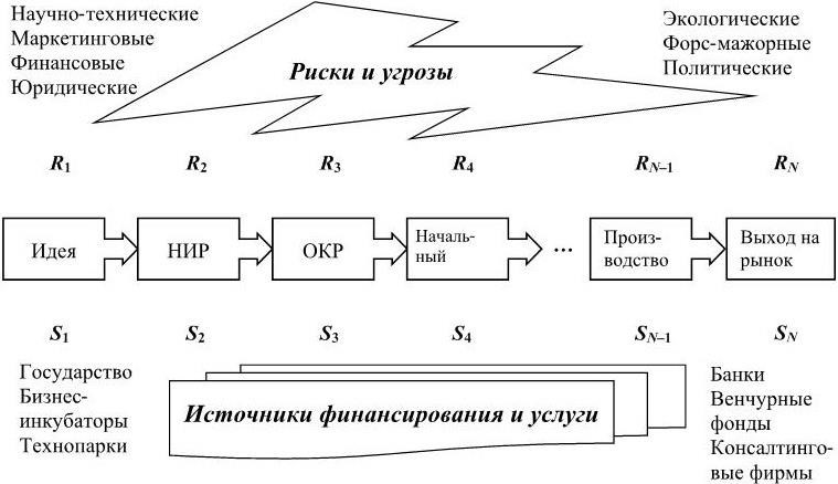 Продвигаясь по цепочке инновационного процесса дальше, приходим к необходимости проведения, например, НИР, которая требует своих инвестиций (S2) и сопряжена со своим уровнем риска (R2). Затем, если эта стадия становления инновации завершается успешно (хотя, очевидно, что на любой стадии может случиться неудача), разработка инновации переходит в стадию ОКР, результатом которой может быть опытный образец какого-либо изделия (технологии). На этой стадии также необходимы инвестиции (S3) и существует свой уровень риска неудачи (R3).