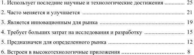 Что касается конструктивного определения, то используем в качестве него мнения экспертов, ответивших на вопрос «Как Вы определили бы, что такое высокотехнологичный продукт?». Они считают, что высокотехнологичный продукт обладает следующими признаками, в %: