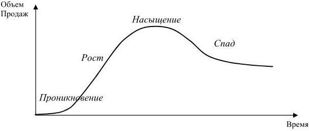 Эти фазы жизненного цикла технологии отражают изменение требований человека к способу и качеству удовлетворения его нужд и желаний, а иногда и развивают новые потребности. Они отражают также особенности освоения обществом нового продукта. Сначала им заинтересовываются люди, склонные к инновациям, и именно через них происходит проникновение товара на рынок. Эта стадия очень важна для судьбы продукта, так как при проникновении продукта на рынок ему приходится преодолевать определенные препятствия, называемые порогами проникновения. Поэтому правильная адресация продукта на стадии проникновения может сыграть решающую роль. Затем, получив импульс от инноваторов, продукт начинает осваивать основная масса потребителей. Эта стадия связана с быстрым ростом продаж, что позволяет также за счет оптимальной организации производства и снижения относительного вклада постоянных издержек на единицу продукции понизить цену на продукт. Затем наступает насыщение, когда только уж самые консервативные люди не пользуются необходимым им продуктом. Затем продукт вытесняется новым, удовлетворяющим ту же самую потребность, но более эффективно в том или ином важном для потребителя смысле – дешевле, качественнее, надежнее и т.п.