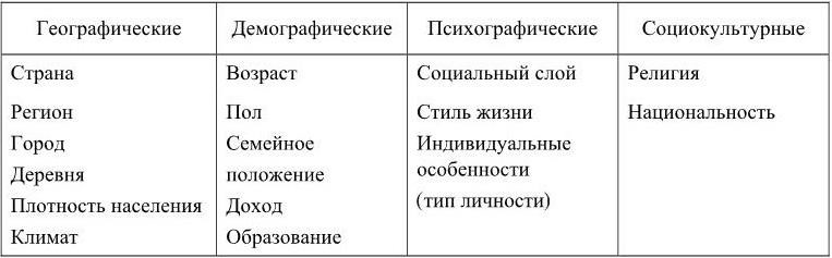 Выбор критериев сегментации рынка не может быть осуществлен по единой схеме. Нельзя сказать наперед какие признаки наиболее эффективно могут быть использованы для разбиения целевого рынка на более-менее однородные сегменты. Все эти признаки очень сильно зависят от того, каким конкретно бизнесом мы занимаемся и от того, кого мы определили как потенциальных клиентов. Тем не менее, специалисты предлагают классифицировать различные критерии по группам. Эта классификация у разных специалистов несколько различна.