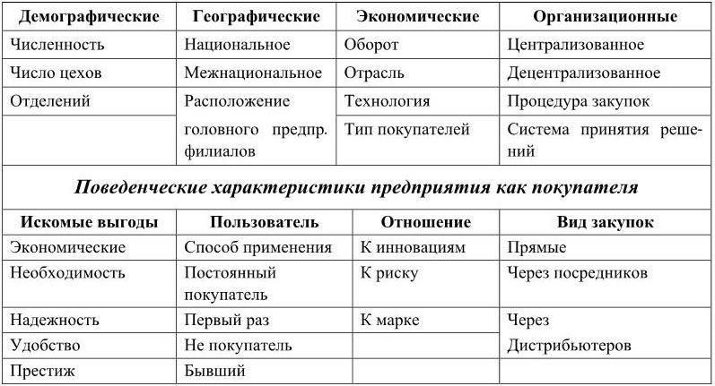 Часть из них совпадает с характеристиками сегментов потребительского рынка – географические, искомые преимущества, статус пользователя, интенсивность потребления, степень лояльности, готовности восприятия товара, отношение к товару. Другая часть связана со спецификой корпоративного рынка – демографические характеристики, имеющие иной смысл, чем для потребительского рынка, технологические, организационные, ситуационные и индивидуальные. В табл. 4.2. приведена точка зрения Э. Виардо.