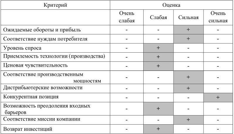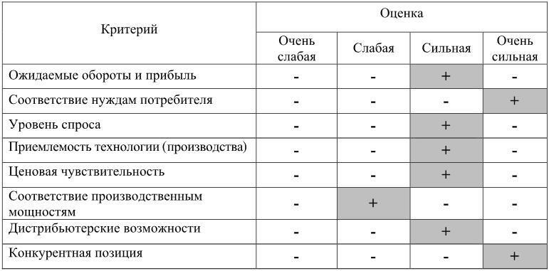 В примере, приведенном в таблице 4.3 единственной слабостью является несоответствие производственных мощностей объему потребности рынка (левее разделительной границы затемнен только один квадратик). Это означает, что при выходе продукта на рынок спрос не будет удовлетворяться, а следовательно, и развиваться в достаточной степени. Задача компании очевидна и заключается в развитии производственных мощностей.