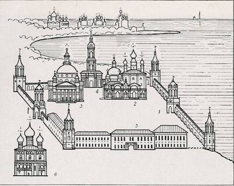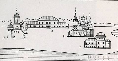 1 – Богоявленский собор; 2 – Введенская церковь; 3 – надвратная церковь; 4 – настоятельский корпус и кельи