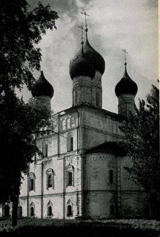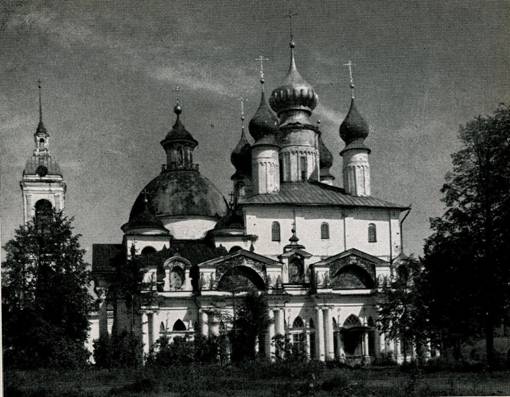 В 1686 году в Яковлевском монастыре была возведена первая каменная постройка – Зачатиевская церковь (илл.43), существующая и поныне. На западной стене храма сохранилась запись, рассказывающая, что строилась она при Ионе Сысоевиче и называлась Троицкой, а в 1754 году переименована в Зачатиевскую. В XVIII и XIX веках церковь с северной и западной сторон была обстроена, тогда же были сделаны и купола с перехватом.