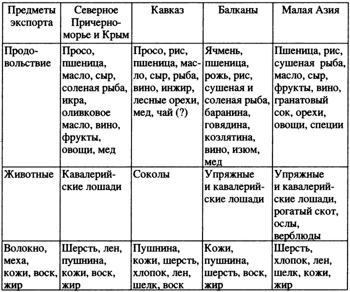 Главными предметами вывоза из Кафы были рабы, рыба, икра, соль, пшеница, ячмень, просо, масло и вино; кроме того, вывозилось много шерсти, шкур ягнят, бараньих кож, говяжьего мяса, сала, нефти, меда, воска и др. Соляные озера у Керчи и Гёзлева снабжали Стамбул и все черноморское побережье столовой и поваренной солью. Азов вывозил главным образом рыбу, икру, кожи и рабов. Ведущие потоки черноморских товаров направлялись в сторону Стамбула, но часть их следовала затем в османские провинции и за границу: рыба – в Венецию, икра – на острова Архипелага, кожи – в Италию, Фландрию, Англию и Францию и т.д.