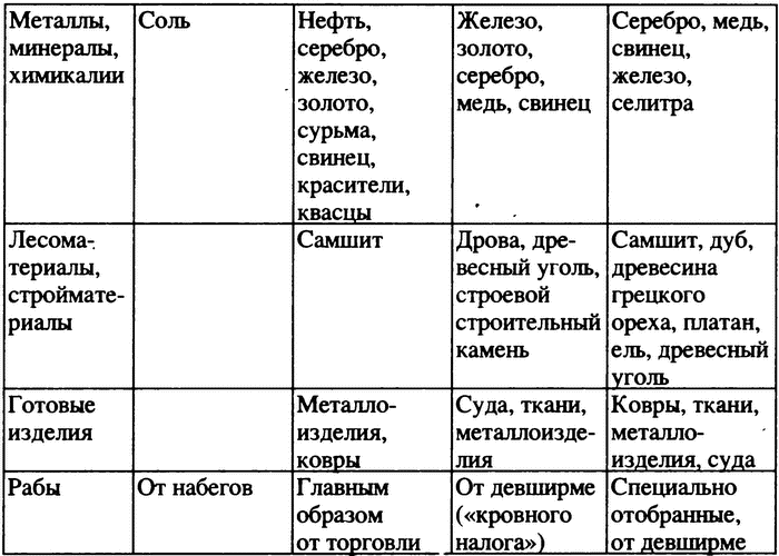 К этим данным можно добавить сведения Р. Мантрана: из Анатолии вывозились также квасцы, бура, такелаж, с Балкан пакля, из России меха и др. О черноморской торговле и ее значении для Турции см. также: 338, с. 180—188. См. аналогичную таблицу К.М. Кортепетера по XVI в.: 597, с. 247.