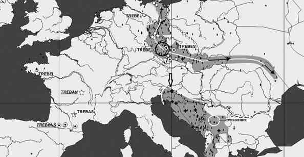Оказалось, что топонимы «treb» существуют и во Франции. И не просто существуют, а некоторые из них являются полными копиями центральноевропейских. Так, селения Trebel обнаруживаются на полуострове Бретань, Эльбе и Шумаве в Чехии, не говоря уже о других топонимах с основой «trebel» (см. карту № 18). У границы с Испанией в верховьях реки Гаронна расположены ойконимы Тrebon(s), некоторые из них являются композитами. В Чехии мы находим Тrebon, Тrebonice, Тrebonin. Французский Тrebаn, он же Тrebon, имеет отклик в Германии – Тrebаnz, а Тrebаs – в Чехии, Тrebеs. Думается, этих примеров боле чем достаточно для того, чтобы убедиться в прямой взаимосвязи топонимических объектов «treb», находящихся в различных областях Западной Европы. «Авторами» подобных названий могли быть кельты, о присутствии которых известно в Галлии и на Карпатах.