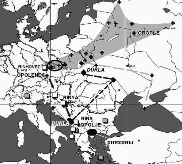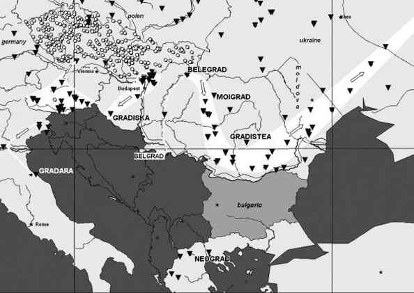 Явно выделяются два укрупненных массива: центральноевропейский, представленный Чехией, Словакией, и балканский, в который входят преимущественно славянские страны, а также Албания и север Греции. Количество топонимов в этом районе настолько велико, что мы сочли необходимым представить их сплошной заливкой, интенсивность которой отвечает плотности массивов. Эти два массива соединяются рядом перемычек. Первая проходит по Румынии. Начинается она от восточной границы Венгрии и Словакии, с верховьев Тисы селением с примечательным именем Belegrad. Следующий топоним Moigrad находится в бассейне рек Быркеу и Сомеш. Далее маршрут переходит в Южные Карпаты по перевалу у города Петрошены и следует к низовьям Олта по его междуречью с Жиу. Здесь расположены Gradinesti, Gradesti, Gradistea. Это славянская лексема претерпела явную румынскую «обработку». Топонимы, следуя по Нижнедунайской низменности на среднем расстоянии 50–80 км от Дуная, пересекают его устье и выходят на просторы Причерноморья. Отсюда открывается прямой путь на Дон.