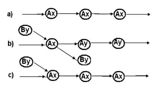 Если рассматривать этот процесс детально, то на первой стадии происходит слияние носителей двух топонимов Ах и Ву с образованием единого сообщества Ах … Ву (Рис. 6-b), в котором носители основы А воспринимают основу «хозяев» В, но при этом сохраняют свой формант х (рис. 6-с). Если эти компоненты расходятся, то появляется индивидуальный топоним Вх (или Ау, как на рис. 6-d). Он снова может войти в альянс с исходным Ву и конвертировать его в Вх (Рис. 6e – 6i).