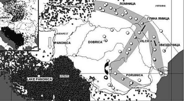 В данном случае заслуживают внимания территории Западной Украины и Румынии, где обнаружен ряд топонимов «ica». Важным в рассматриваемом аспекте является то обстоятельство, что они формируют явные полосы и цепочки. Мощный отток наблюдается в районе стыка границ Словакии и Польши в юго-восточном направлении. Его формируют Ломница, Кружельница, Шодница, Коросница, Клодница и др. На севере Молдавии у поселения Глина Ямица этот поток разветвляется. Одна ветвь (Тибрица, Лопатица, Звездочица) следует на юг в устье Дуная, другая движется на юго-запад по долине реки Олт. В ее среднем течении происходит изменение направления на юго-восточное, идущее на Бухарест. В среднем течении Дуная на левом берегу имеется населенный пункт с примечательным названием Panonica. Можно было бы полагать, что он имеет местное происхождение, естественным образом связанное с древним названием части Венгрии – Паннония. Однако в Боснии мы находим озеро с таким же именем. Вероятно, славяне, имея информацию о Паннонии и придя в эти места, назвали поселение этим именем.