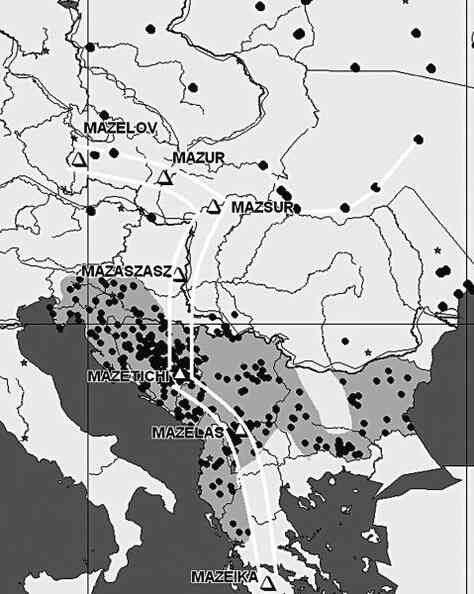 Наиболее отдаленным объектом «ika», проникшим в Грецию, является селение Mazeika (Мазейка). Славянская фонетика не вызывает сомнения. Достаточно сказать, что село с подобным названием существует в Липецкой области. Попытаемся отследить названия с этой основой. Они имеются в Польше, занимая преимущественно ее восточную часть, но связей с южным массивом не просматривается. В центральной части Чехии мы встречаем название Mazelov, а на границе со Словакией Mazur. Ближе к Венгрии на реке Ипель примостился его «однофамилец» Mazsur. Разница состоит в транскрипции. Следующий топоним в южном направлении мы встречаем на правом берегу Дуная, только теперь он выступает уже в венгерском «обличии» – Mazaszazs. Путь продолжается в Боснии и Герцеговине селением Mazetichi и Mazelas в Македонии.