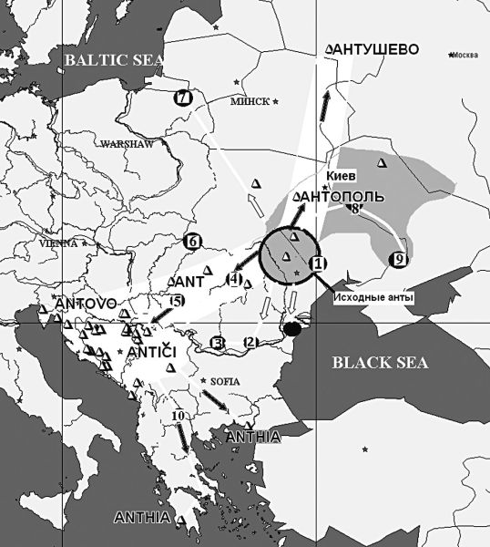 Поначалу наибольшая плотность антского населения наблюдается на севере верховий Прута и Днестра, в бассейне его притоков Сирет и Збруч. Западнее Днестра ранних антов не было. Далее последовало заселение пруто-днестровского междуречья (Карта № 3). (К рассмотрению топонимики мы приступим несколько позднее.) Отсюда они расселяются на юг в Нижнее Поднестровье (1) и начинают продвижение на Балканы. Другой поток движется на земли Буковины и спускается на юг по Сирету (2), в провинцию Мунтения, выходя значительно выше дельты Дуная. Здесь осуществился контанкт с романо-дакийцами. Некоторые группы продвинулись далее за Олт (3). Другая группа смещается к западу от Прута (Ботошаны) и оказывается в Дакии(4), где играет главенствующую роль в союзе со словенами. Анты отмечаются в области гепидов Южной Трансильвании (5), а также в верховьях Тисы (6). В конце VI века они осваивают дельту Дуная и Скифию, где возникают словено-антские поселения. В результате смешения с дулебами возникает луко-райковецкая культура.