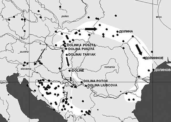 Именно от словацкого массива отделяются две ветви. Первая, более контрастная, проходит сквозь Западную Украину и ее юго-западную часть, Молдавию, форсирует устье Дуная, вторгается в Болгарию и останавливается, едва перейдя границу Румынии. В Словакии основным типом топонимов являются Dolina и Dolinka(y). Это не только поселения, встречаются и горы (!). На территории Западной Украины и Молдавии к Dolin’е добавляются Dolinyany (Долиняны). Юг Молдавии представлен прилагательными с той же основой. В Болгарии это та же Dolina. Примечательно, что в Центральной России эти топонимы так и не появляются, они предпочли Северное Причерноморье и Кубань.
