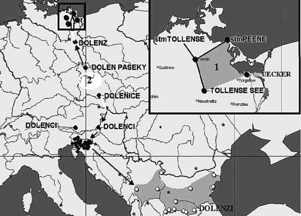 Топонимия довольно проста и представляет собой два массива в Словении и Южной Балтике, соединенные четырьмя топонимами, проходящими через Чехию. Существует и третий, совершенно изолированный массив в Болгарии, частично захватывающий Сербию (карта № 10).