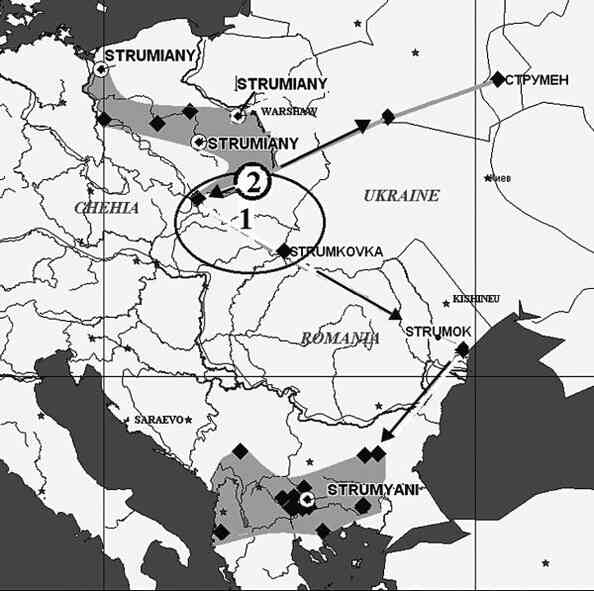 Попытаемся установить район исхода, который одновременно будет являться ареалом зарождения племени. Это должна быть область, откуда наблюдается разнонаправленное движение, то есть исход по различным направлениям. В принципе, эту роль может выполнять область (1), где расположены три топонима: Strumien, населенный пункт и одноименная река на Висле, а также селение Струмковка.