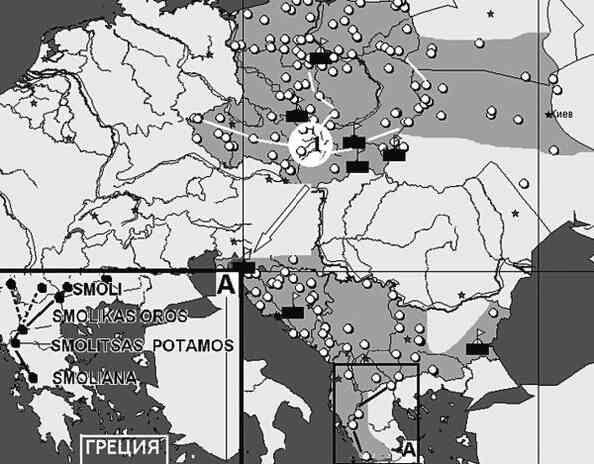 Топонимы с основой «смол» интенсивно представлены в Польше, Чехии и Словакии. Они образуют единый массив. Другой массив занимает практически все Балканы. Несколько топонимов имеется в Греции, последний – в Старом Эпире. Перечислять их нет необходимости, детально с этим можно ознакомиться в [11]. Между этими массивами связующие звенья отсутствуют. Поэтому на данном этапе не представляется возможным сделать вывод о маршрутах проникновения «смолян» на Балканы. Но, поскольку оно, безусловно, существовало, то должно было оставить свои следы, которые предстояло отыскать. Если переносилась топооснова, то могли переноситься целые топонимы или укрупненные топоосновы. Линия, соединяющая отдельные представители, находящиеся в различных массивах на минимальном расстоянии друг от друга, и будет являться если не точным маршрутом, то указанием на него.