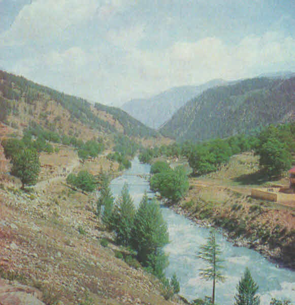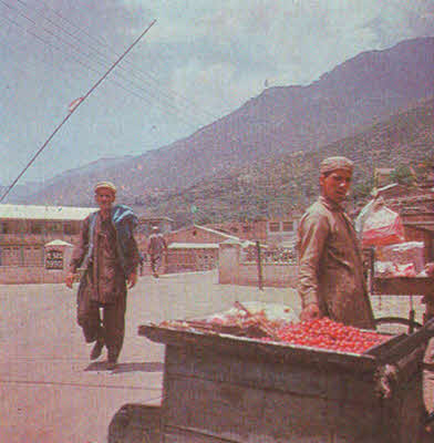 Время от времени шоссе превращается в торговые улицы селений, где пестрая толпа образует живописный фон, хотя в маленьких бедных лавочках местного рынка представлен довольно скудный ассортимент местного натурального хозяйства, в том числе полосатые домотканые материи. Исключение составляют штабеля аккуратно распиленных смолистых балок, напоминающих бруски сливочного масла. Строительный лес, который очень дорог в Пакистане, – главное богатство Свата. Славится Сват и диким медом, исключительным по аромату и вкусу.
