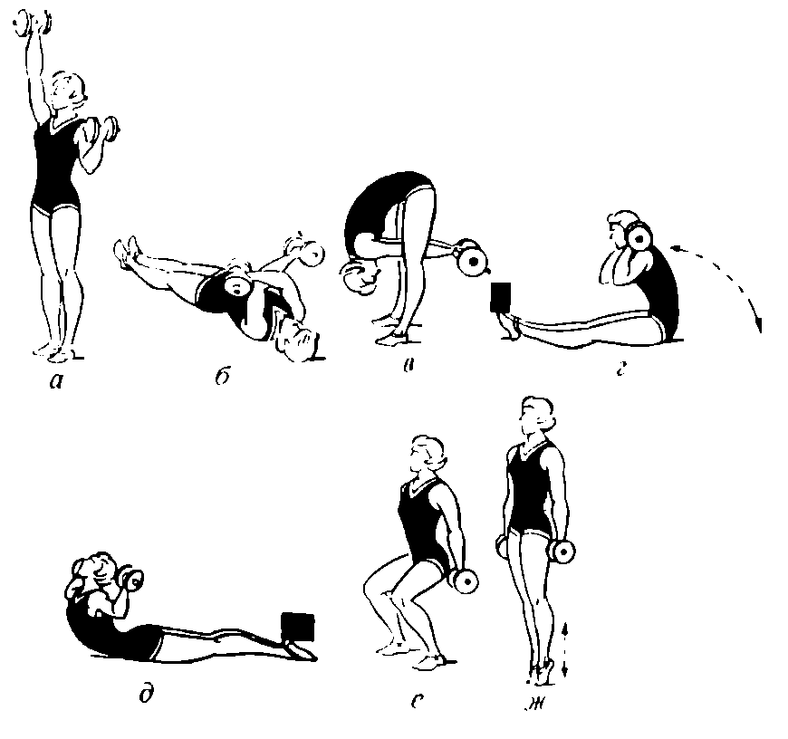 7. И. п. – о. с., гантели в опущенных руках, пальцы ног на небольшом возвышении, пятки на весу: поднимитесь на носки, вернитесь в и. п. (рис. 44, ж). Повторите упражнение до утомления.