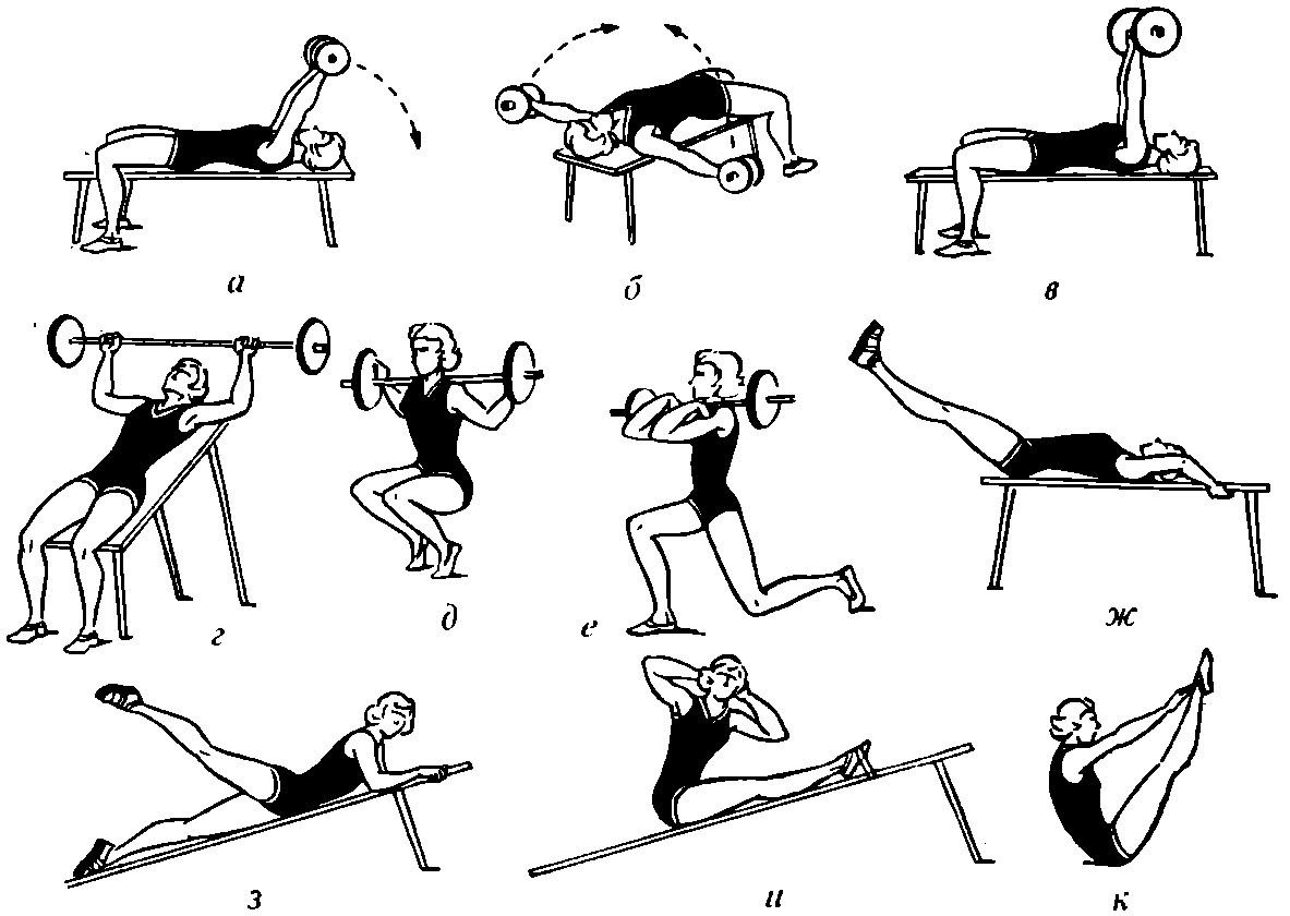 Какой вес отягощения оптимален? Здесь определяющими являются возраст, вес, сила, состояние здоровья. Начинайте с наиболее легкого веса: гантели – 2–3 кг, штанга – 20–30 кг. Такой вес может показаться небольшим после первых повторений, но для выполнения последующих потребуются определенные усилия. На этом этапе тренировки вес в каждом упражнении должен быть таким, чтобы последние 1–2 повторения давались с трудом. Если эти повторения не кажутся вам трудными, прибавьте по 0,5 кг к весу гантелей и 1 кг к весу штанги, поступайте так периодически по мере увеличения силы, но ни в коем случае не форсируйте нагрузку, не перенапрягайтесь. Помните, что данный комплекс сугубо специфичен, он рассчитан только на здоровых женщин до 40 лет и то при условии регулярного медицинского контроля. При первых признаках переутомления снизьте нагрузку или вовсе прекратите занятия до тех пор, пока не будет исключена причина недомогания.