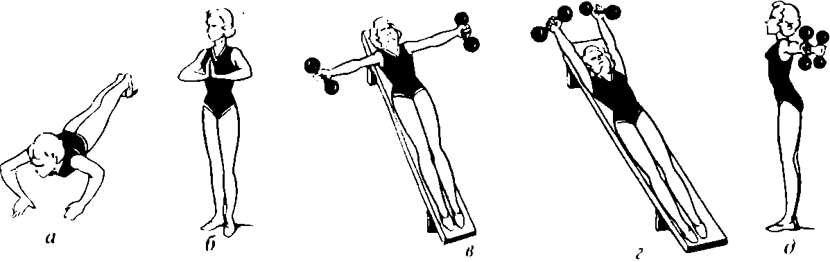 4. И. п. то же, но прямые руки с гантелями опускать вверх за голову, слегка прогибая позвоночник. Опуская руки – вдох, возвращаясь в и. п. – выдох. Повторить 10 раз. Данное упражнение хорошо развивает нижнюю стенку груди, как бы приподнимая ее, позволяет избавиться от отвислости грудной мышцы (рис. 47, г).