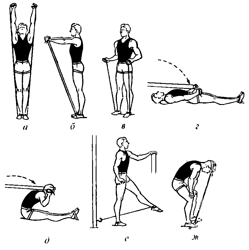 Во время отпуска, когда вы путешествуете, тяжелые спортивные снаряды удобно заменить небольшим резиновым амортизатором. Это круглый резиновый жгут толщиной 3–5 мм или ленточная резина длиной 2–5 м.