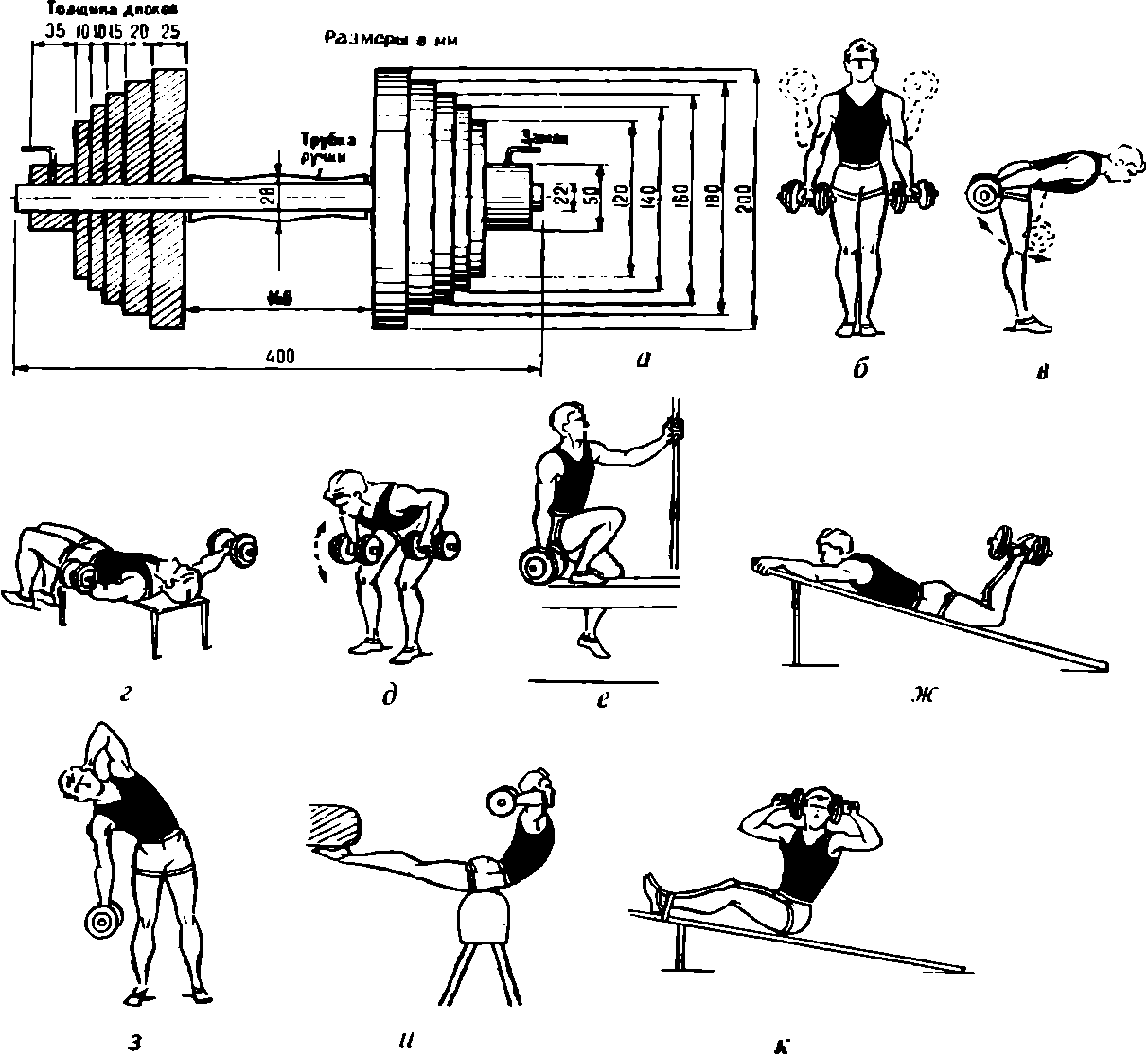 Состоят такие гантели их трех частей: стержня, дисков и замков. Основу снаряда составляет металлический или деревянный (например, из хорошо выдержанного дуба) стержень длиной 35–40 см и диаметром 22–30 мм (рис. 7, а). На середину стержня устанавливается деревянная полая ручка с отверстием, диаметр которого равен диаметру стержня. Диски могут быть металлическими, выточенными из стали или чугуна, либо деревянными диаметром 10–20 см. В центре каждого диска высверливают отверстие в соответствии с диаметром стержня так, чтобы диск надевался на него свободно. Замок (зажим) представляет собой отрезок металлической трубки с имеющим резьбу отверстием, в которое вставлен винт. Головка винта должна быть удобна для завинчивания рукой.